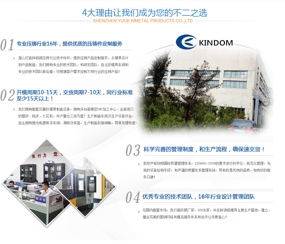 浙江錦恒金屬制品有限公司前身為海寧長命摩擦材料有限公司,創(chuàng)建于2002年,是一家集模具設(shè)計、制造、鋁合金、鋅合金壓鑄、沖壓加工、表面處理為一體的專業(yè)制造公司,為汽車、摩托車、沙灘車、燈具、網(wǎng)絡(luò)天線、監(jiān)控設(shè)備等行業(yè)提供精密壓鑄件及精密沖壓件。